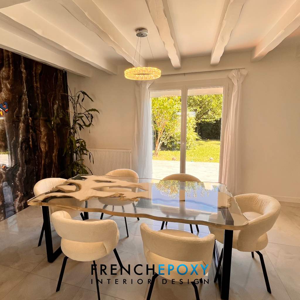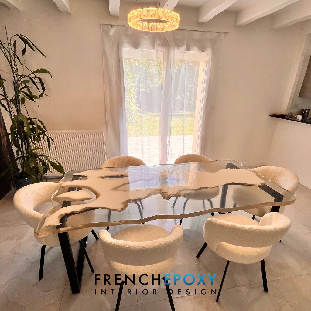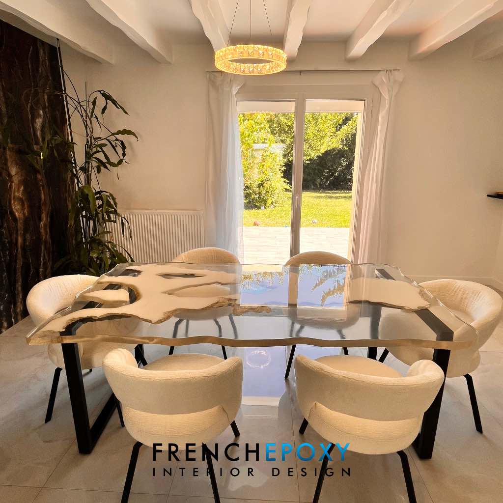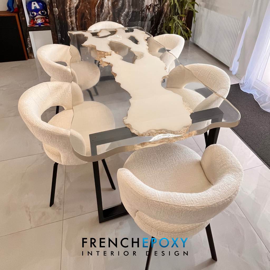 Découvrez l’élégance naturelle de cette table en bois massif blanc et résine époxy transparente, une création unique signée French Epoxy.