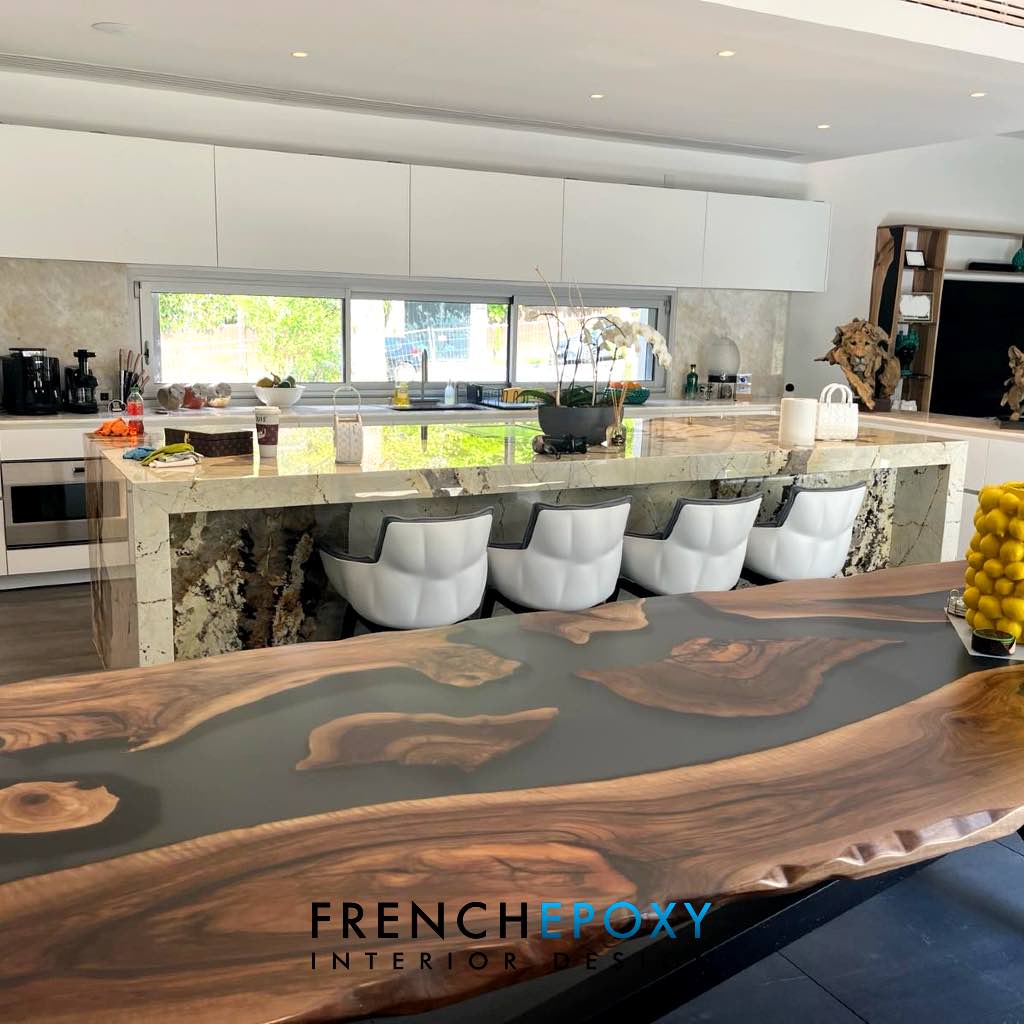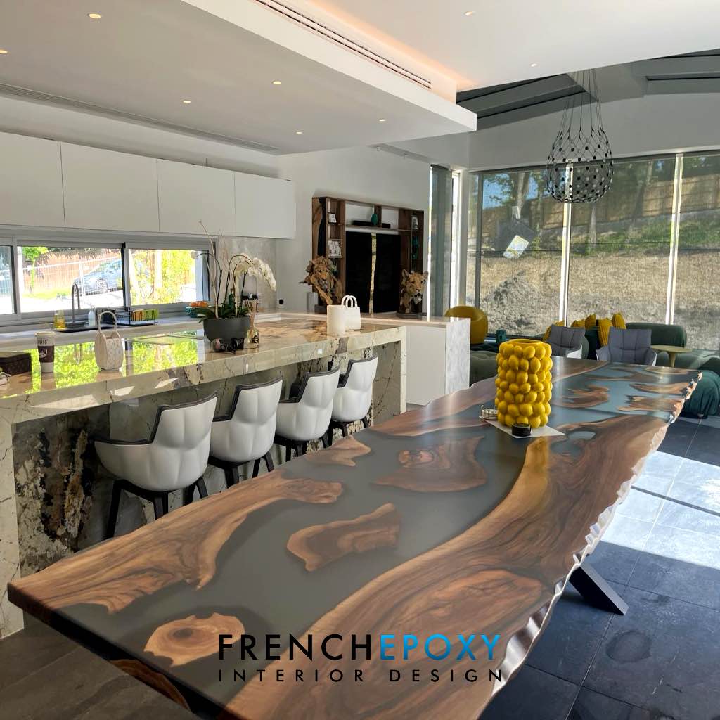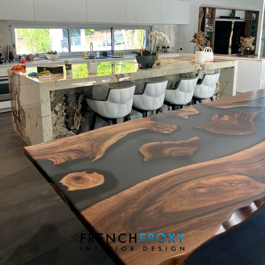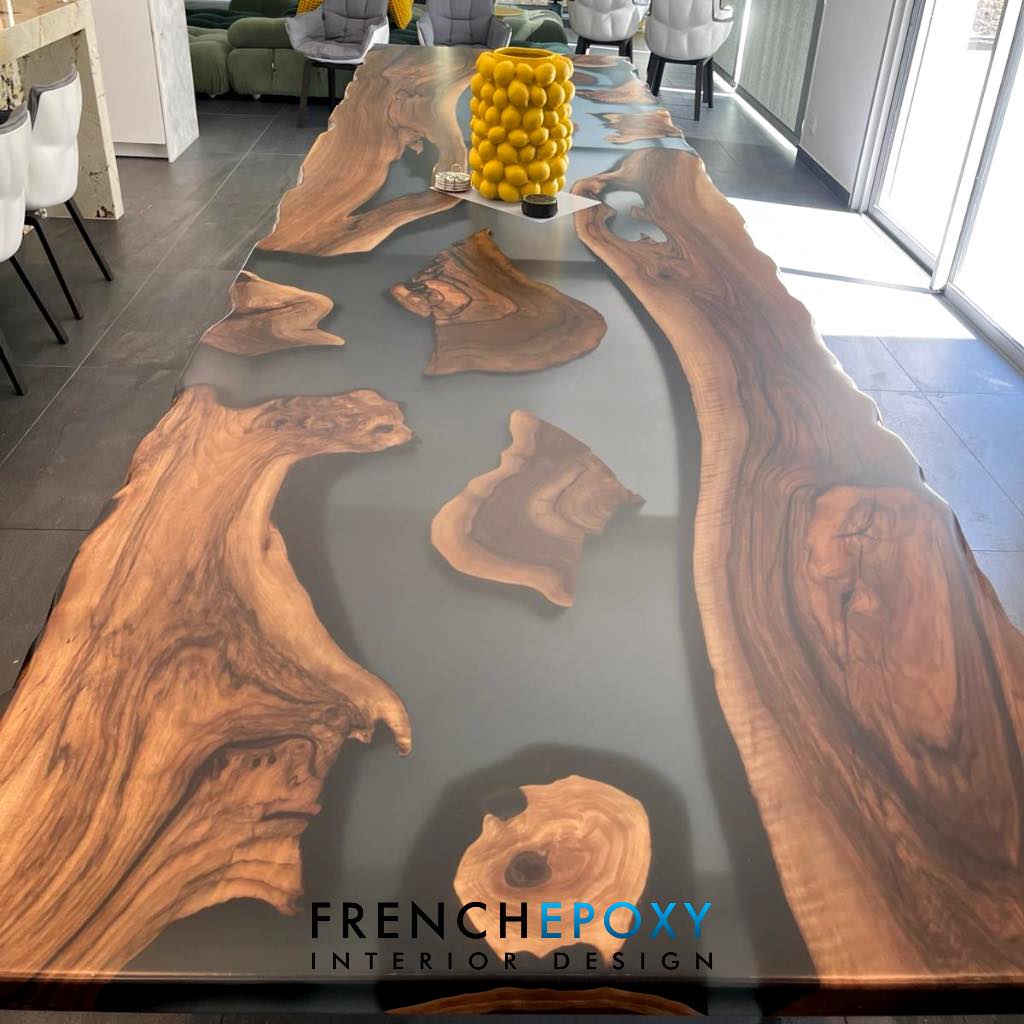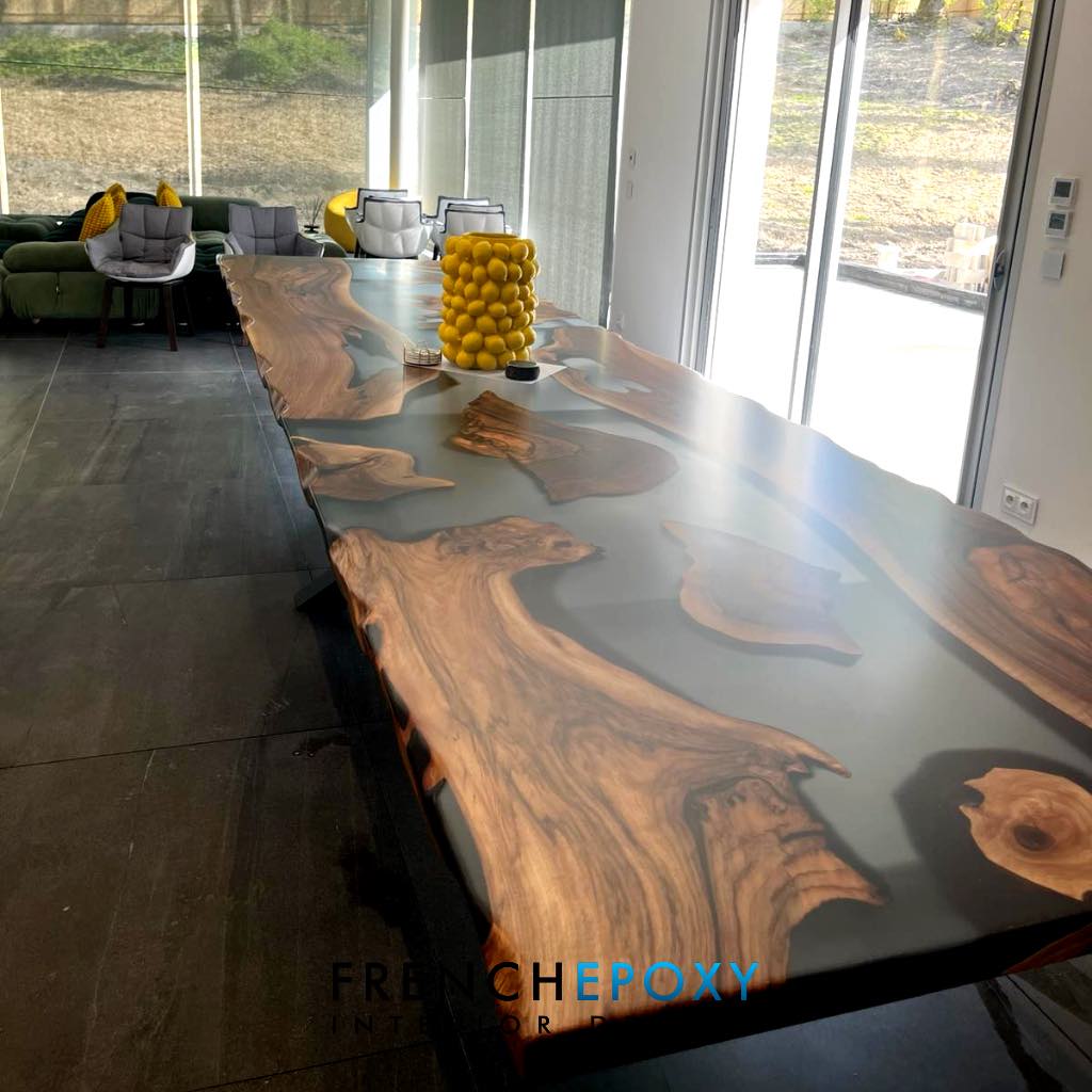 French Epoxy propose également la personnalisation complète de la teinte du bois, du type de résine (noire, transparente, métallisée…) et du piètement. Chaque client participe ainsi à la création de sa propre œuvre sur mesure.