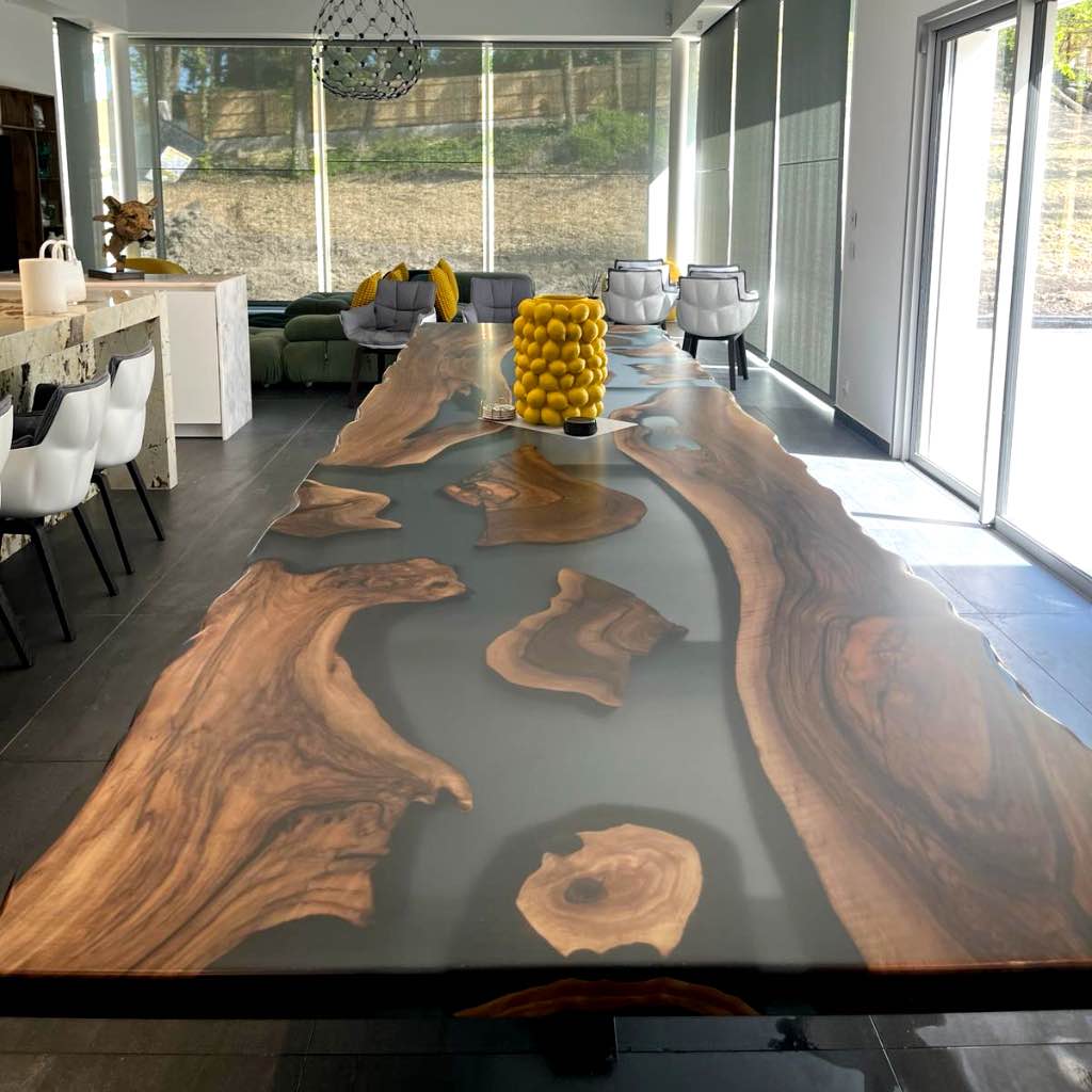 Chaque modèle est unique, lors de votre commande on étudiera ensemblevotre choix des planches de bois en noyer, la coloration exact de la résine ainsi qu’un piétement sur mesure vous sera proposé.