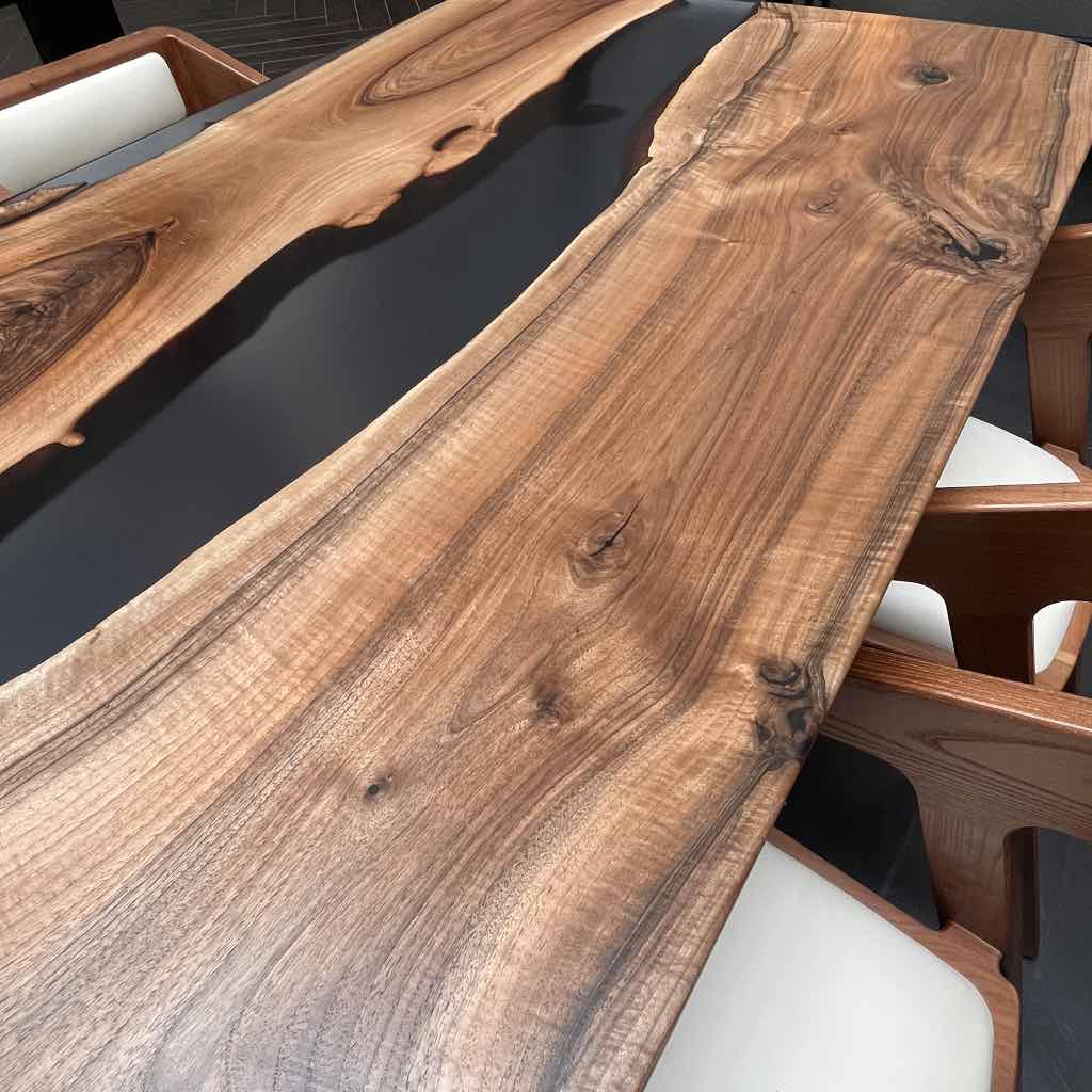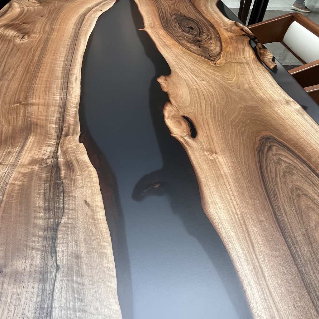 Chaque table est fabriquée artisanalement dans notre atelier French Epoxy, à partir de bois massif soigneusement sélectionné pour ses veinages uniques et son caractère authentique. Les deux plateaux en bois massif de noyer sont sublimés par une rivière centrale en résine époxy noire, créant un effet visuel puissant et sophistiqué.