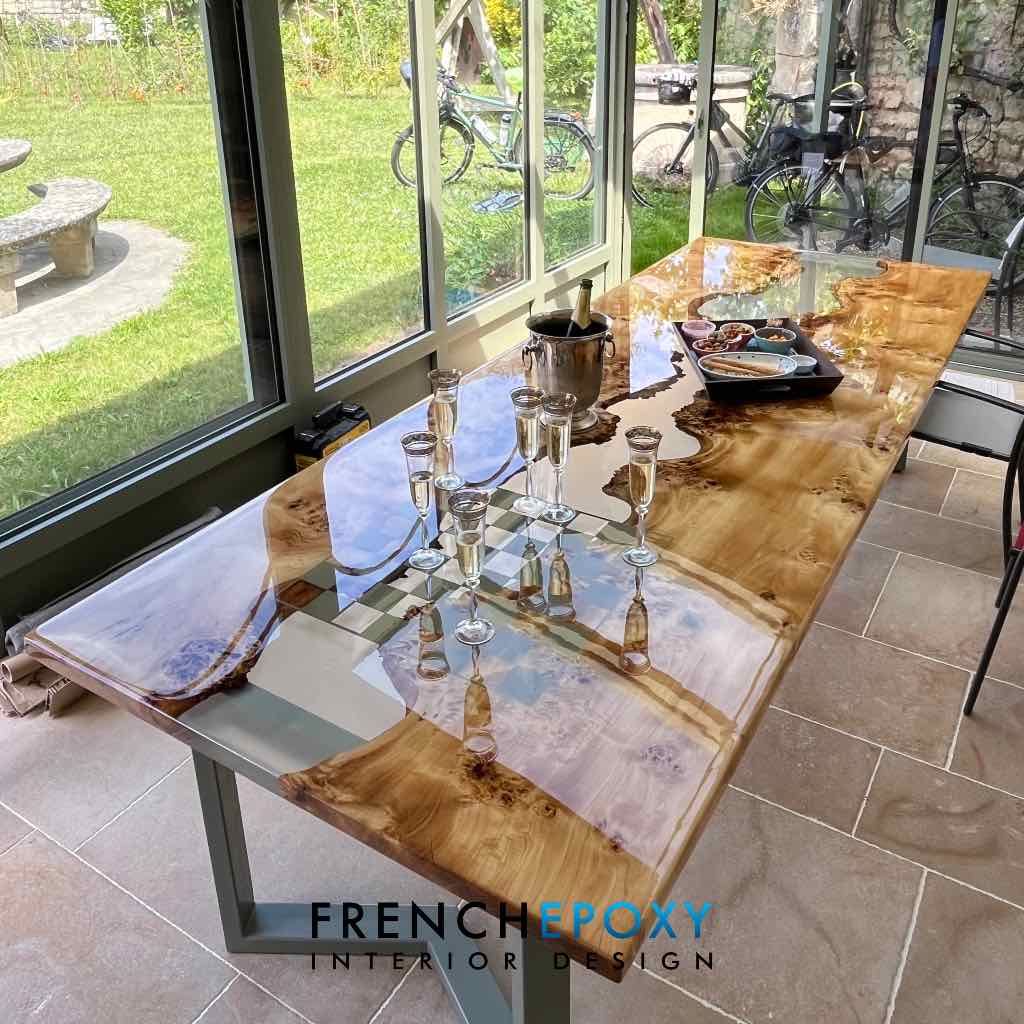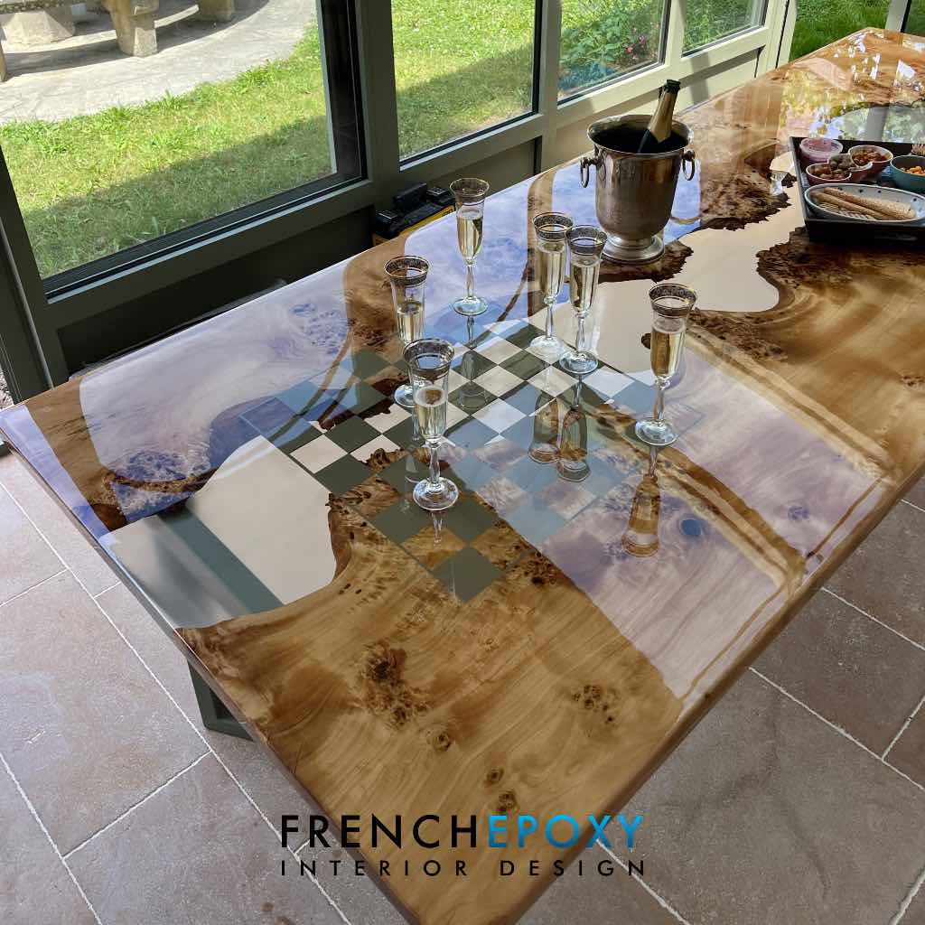 Table époxy avec échiquier intégré en bois massif – Pièce unique sur mesure