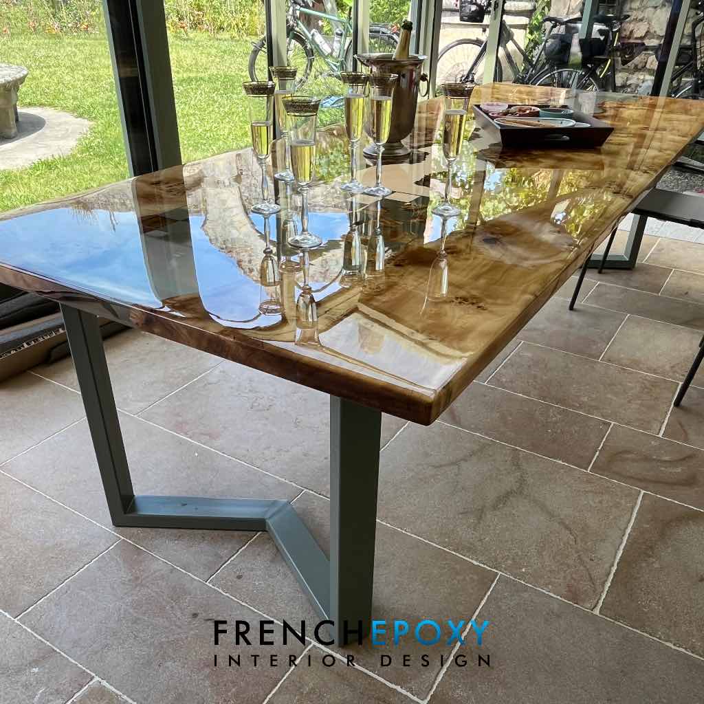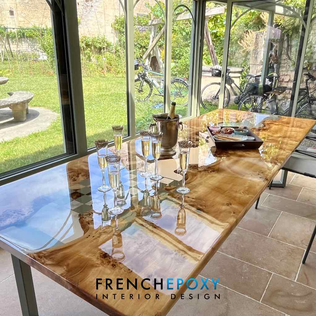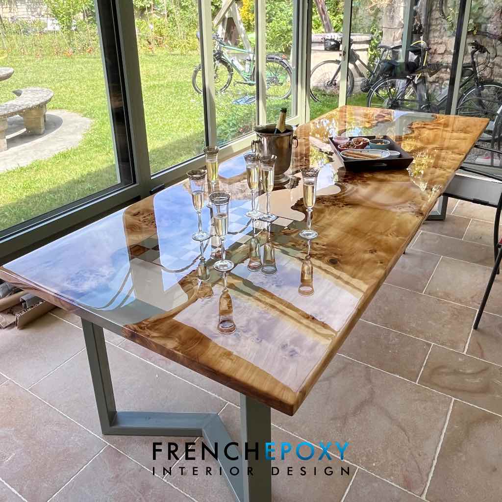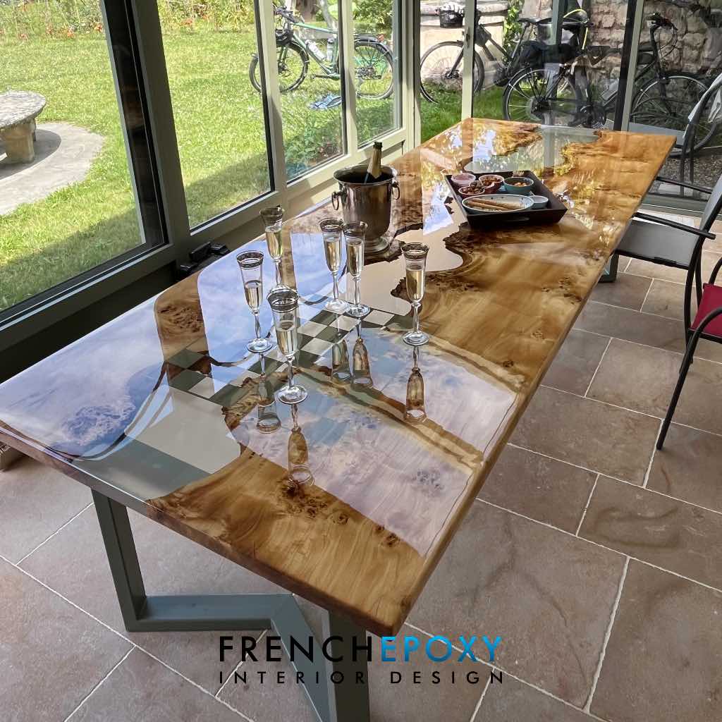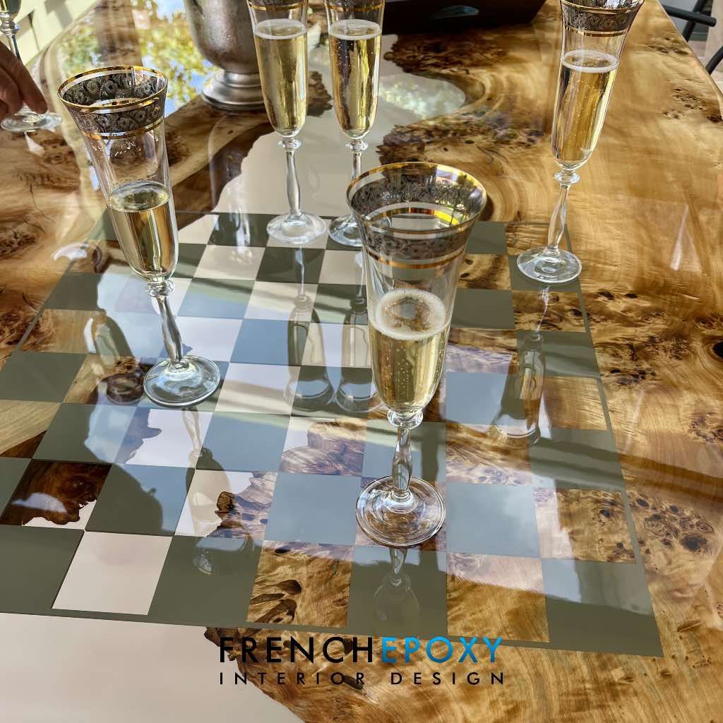 Chaque table en bois et résine époxy avec échiquier est fabriquée à la main, garantissant une finition irréprochable et une durabilité exceptionnelle. Le veinage naturel du bois et la transparence de la résine rendent chaque modèle totalement unique.
