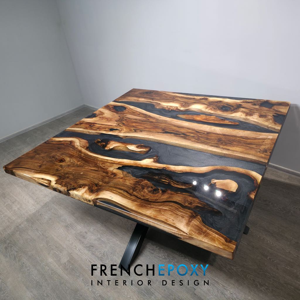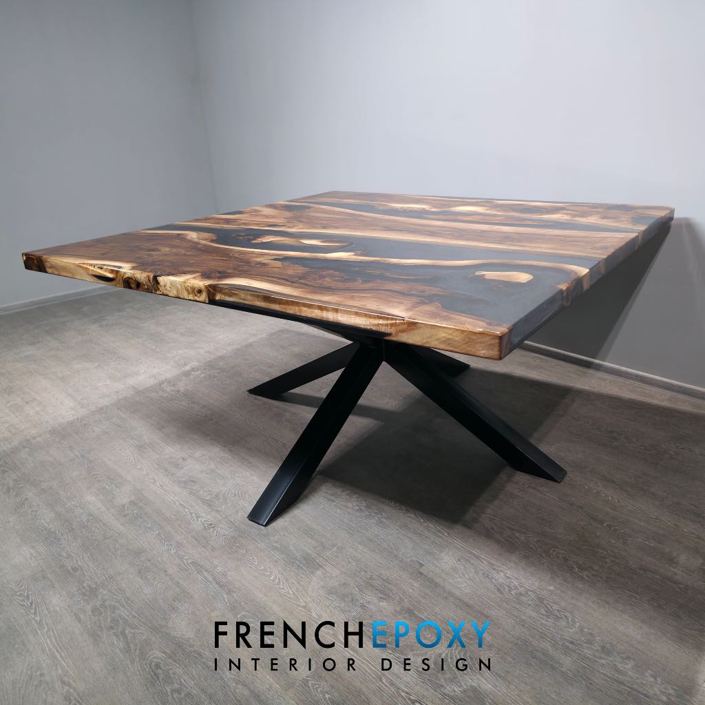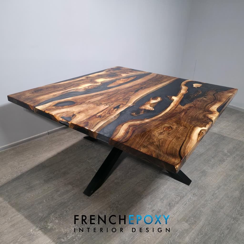 La finition brillante effet miroir met en valeur chaque détail : nœuds du bois, nuances naturelles et profondeur de la résine. Cette table carrée s’intègre parfaitement dans un intérieur moderne, contemporain ou même industriel.